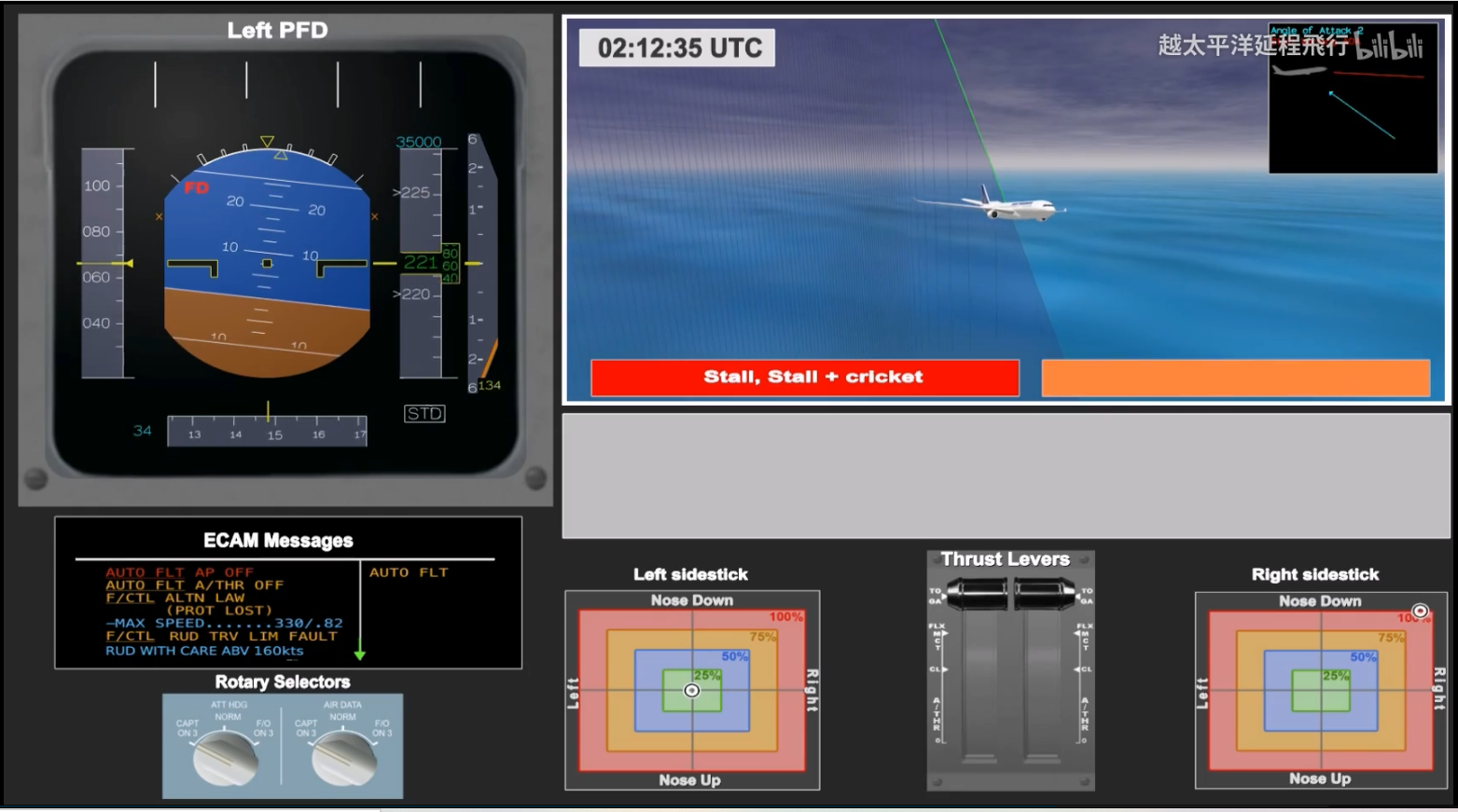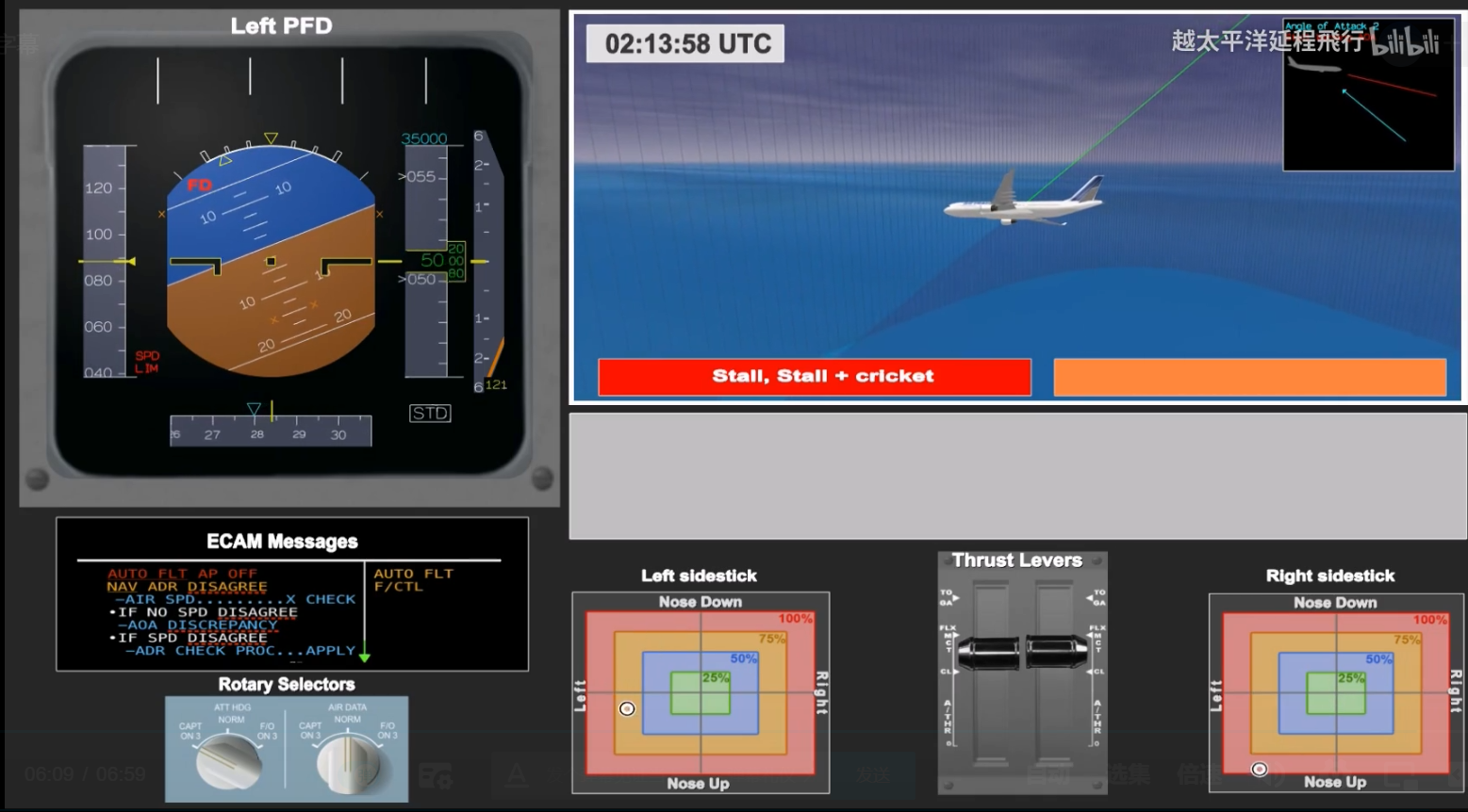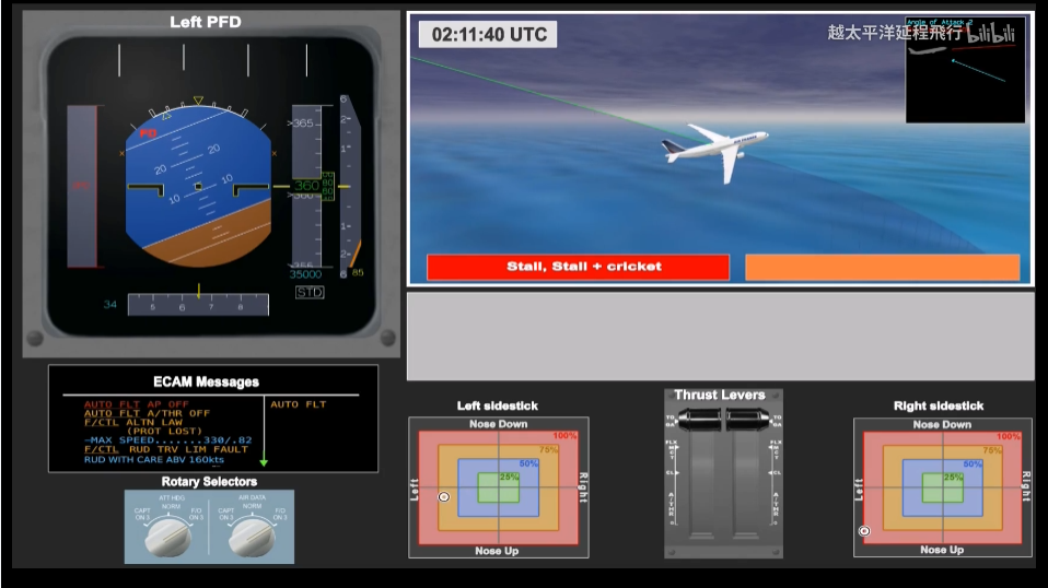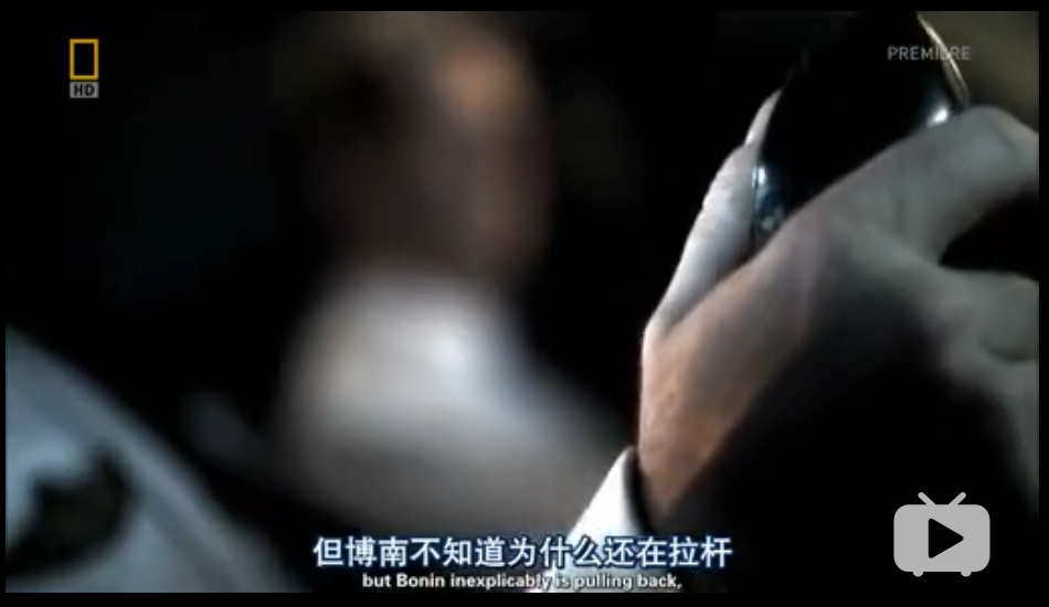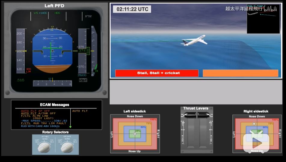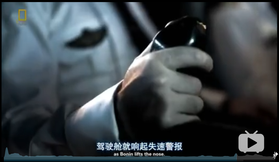 接下来,该片中表示“即使另一名飞行员罗伯特告诉博南需要推杆,博南仍然一直在拉杆”;然而,FDR数据显示博南听从了罗伯特的建议,开始推杆(模拟动画中可以很明显看见右座侧杆在“nose down”位)。同时,ECAM上显示了最大速度,调查报告中表示这可能使机组更担心飞机超速而非失速,然而该细节没有展示在该片中。