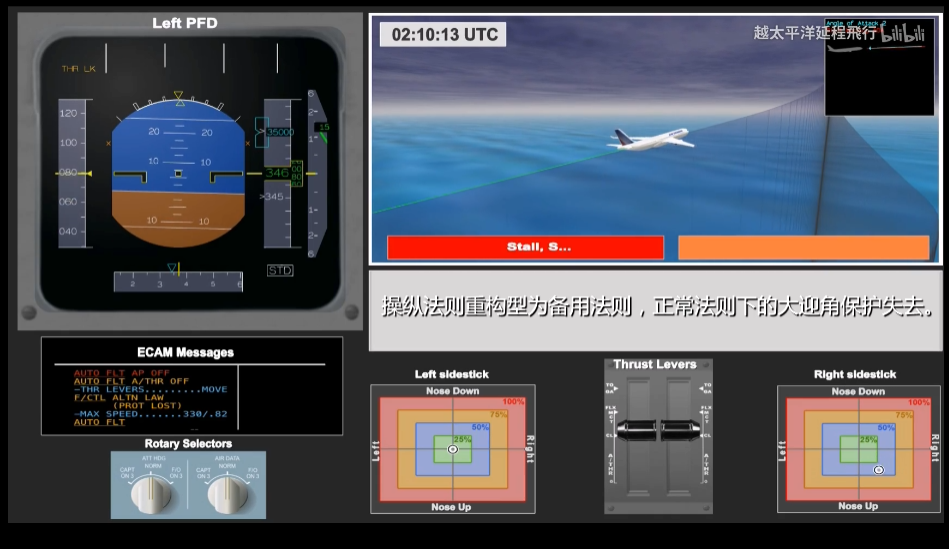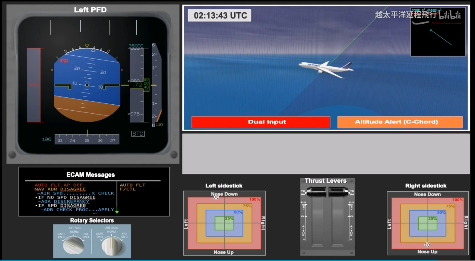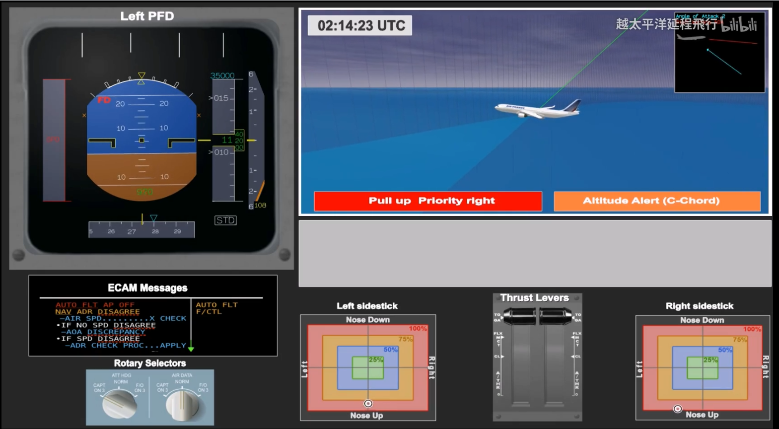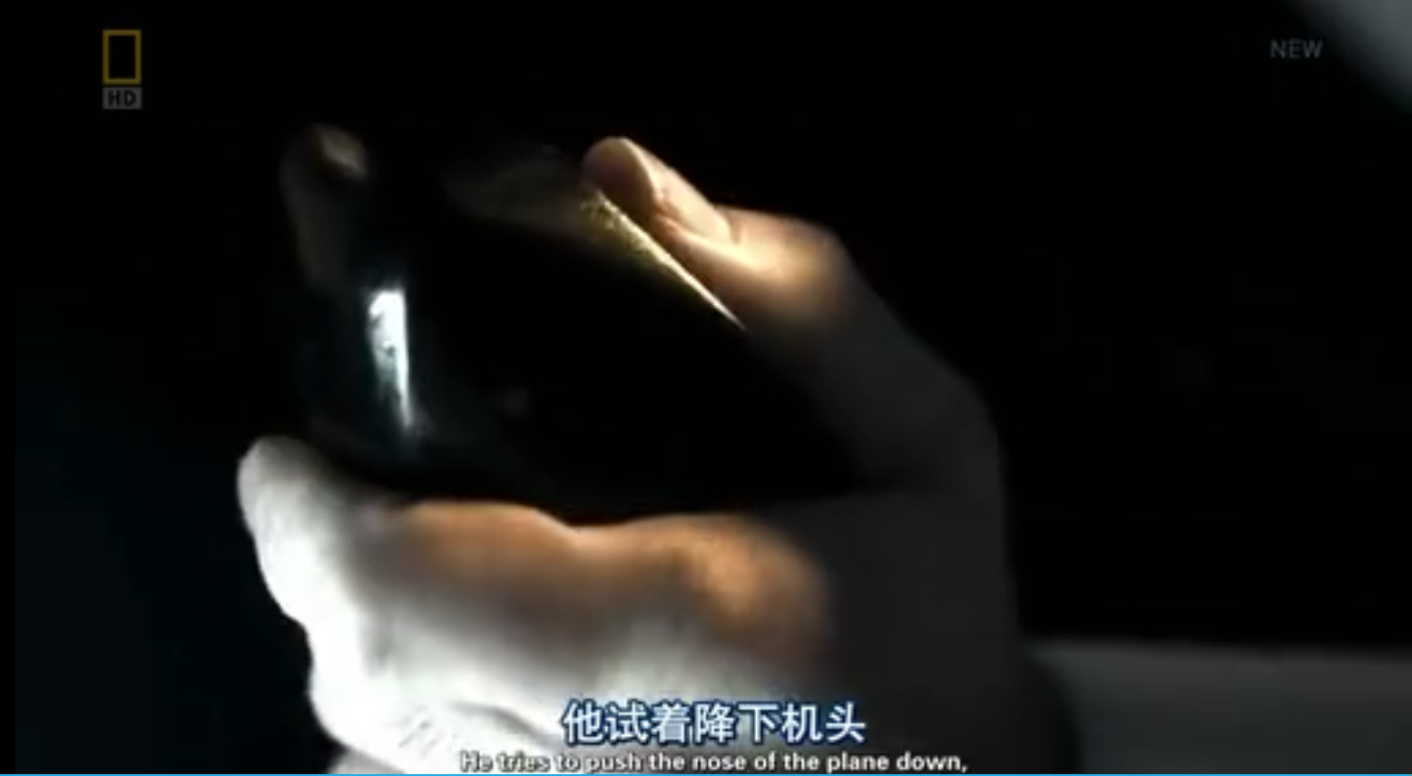 接下来,该片中表示“即使另一名飞行员罗伯特告诉博南需要推杆,博南仍然一直在拉杆”;然而,FDR数据显示博南听从了罗伯特的建议,开始推杆(模拟动画中可以很明显看见右座侧杆在“nose down”位)。同时,ECAM上显示了最大速度,调查报告中表示这可能使机组更担心飞机超速而非失速,然而该细节没有展示在该片中。