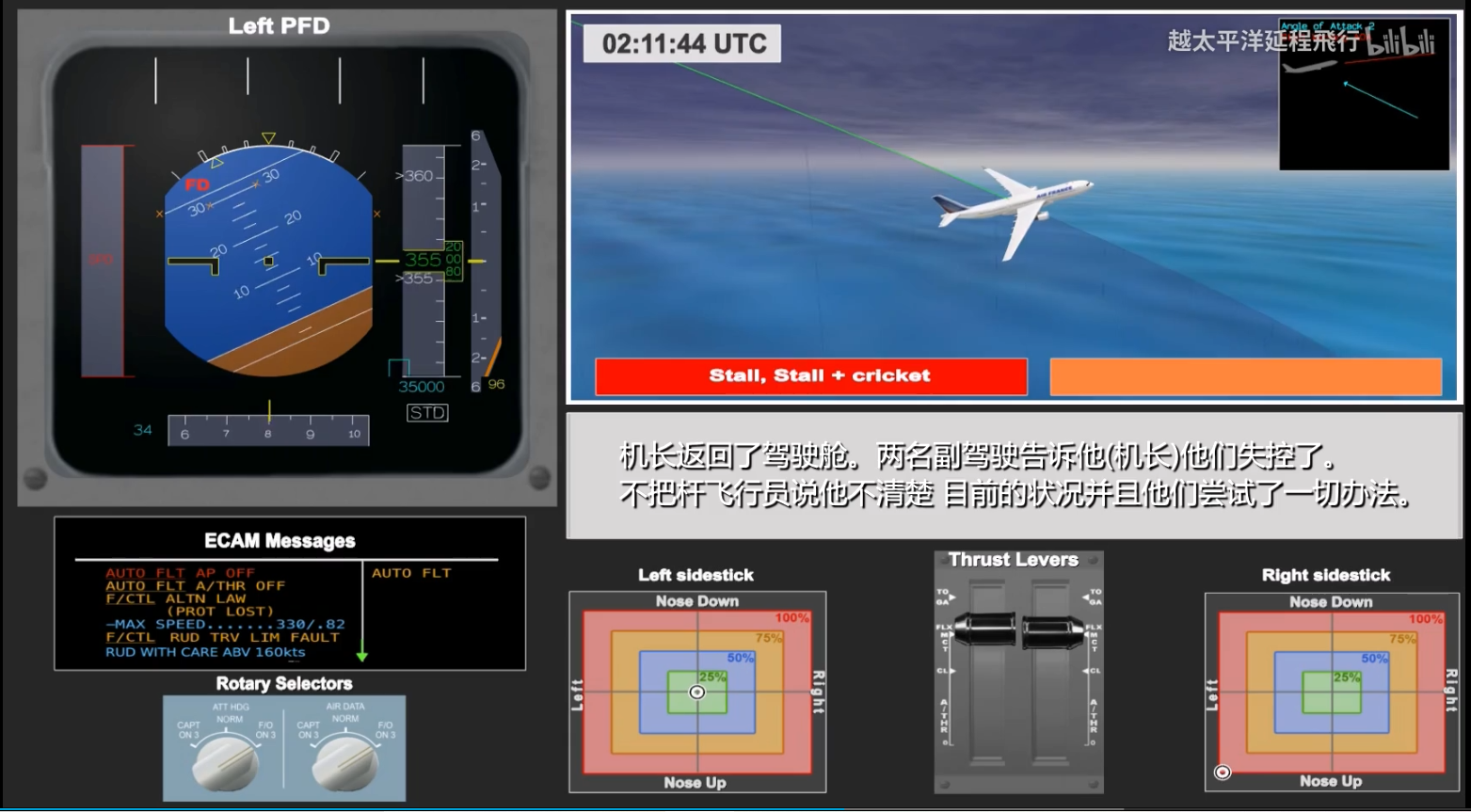 此时,由于空速过低(三根皮托管测出的空速数据都小于60 kt),飞机认为这是电脑出了故障而抑制了失速警告,随后飞行员曾多次尝试推杆降低攻角,这使得空速回升,虽然还是失速但电脑认为这个值是有效的,再次触发了失速警告,这使得飞行员更加困惑;而如此重要的信息ACI里竟然一句都没提。