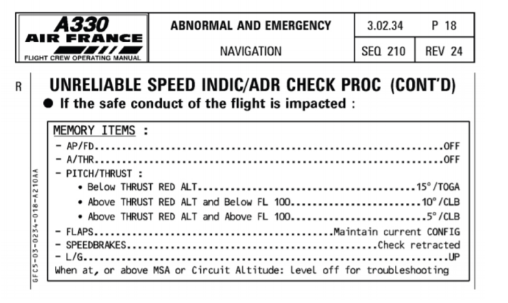 在空难发生前几分钟,冰晶堵塞了皮托管,导致空速读数不一致,飞机的自动驾驶仪立刻断开,同时保护法则切换至备用。此时博南接手控制并开始拉杆。